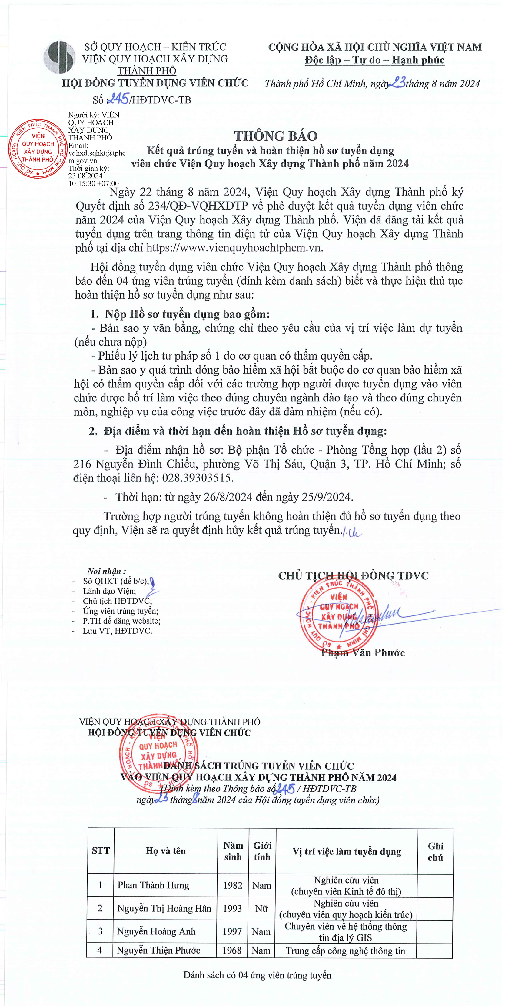 20240823 245 TB Kết quả trúng tuyển và hoàn thiện hồ sơ tuyển dụng Viên chức Viện Quy hoạch Xây dựng Thành phố năm 2024